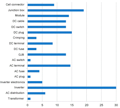 圖4統(tǒng)計(jì)174個(gè)因火災(zāi)而元件受損案例的元件位置,可以發(fā)現(xiàn)DC端的損壞最多,但是AC端的故障率也意外的高。雖然看數(shù)字是低於DC端元件,但是AC端元件數(shù)量比DC端少很多(大約1/10的程度),而且AC的技術(shù)人員通常受過(guò)比較嚴(yán)謹(jǐn)?shù)挠?xùn)練,這麼高的故障率讓人意外。另外特別說(shuō)明,這裡所列的是燒毀受損的元件,但受損元件未必就是火災(zāi)的原因。圖5做了更細(xì)的統(tǒng)計(jì),受損元件大部分集中在模組與逆變器,DC接頭和壓接頭(crimping)合起來(lái)的數(shù)量?jī)H次於模組損傷,也是重要問(wèn)題。AC部份最多的是AC端子,大部份是人為安裝失誤。