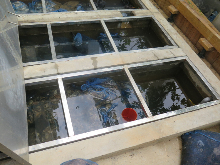 庭園中有一個池子,養(yǎng)著牡蠣殼和高粱桿,用來過濾水中的氮跟氨。記者馮靖惠/報導(dǎo)